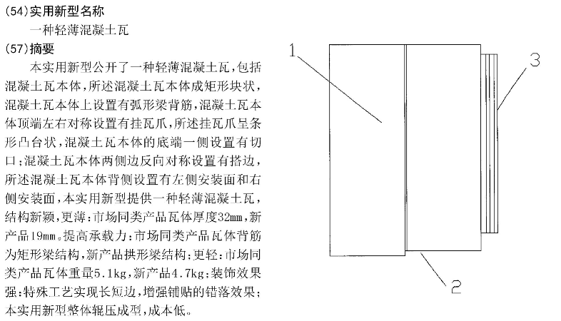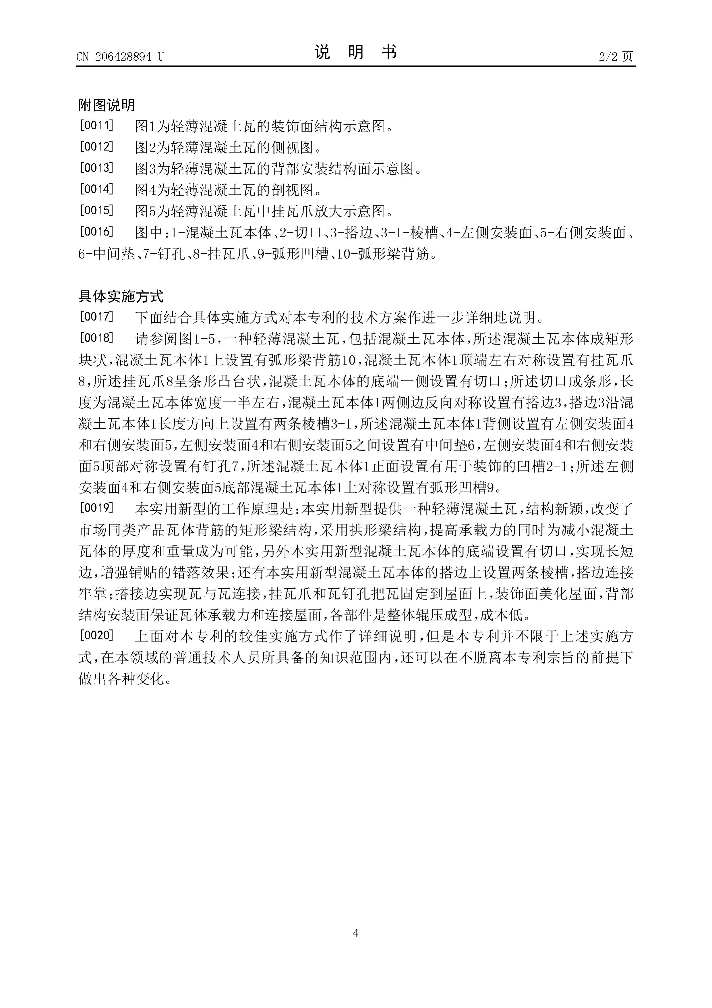 5.根据权利要求1所述的轻薄混凝土瓦,其特征在于,所述左侧安装面和右侧安装面底部混凝土瓦本体上对称设置有弧形凹槽。